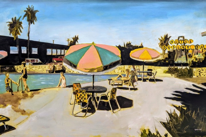 Seth Smith, “Dust,” Oil on panel (SOLD) A fabulous retro poolside scene. Ready to hand and framed in a natural wood frame with gold accents.