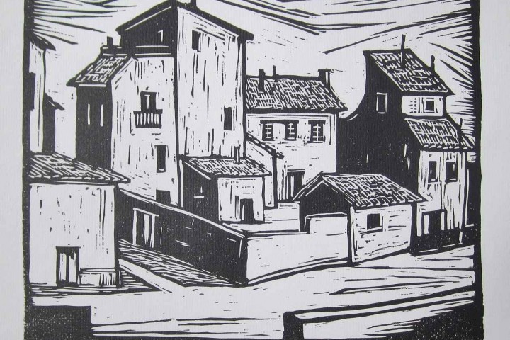 Sue Jean Covacevich, “Malaga Houses”, Woodblock print