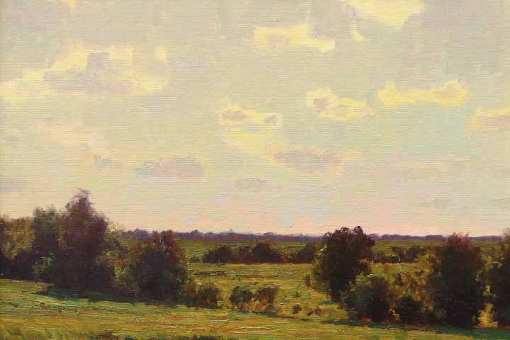 Todd Matson, “One Mile One Color” oil on canvas board (SOLD) Kansas landscape scene with trees in an open field. Framed.