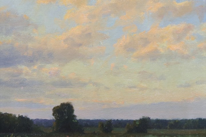Todd Matson, “September Evening” oil on canvas board (SOLD) The colorful Kansas sky at dusk over the prairie. Framed.
