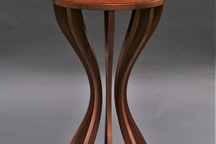 Tracy Fiegl, “Vane”, Madrone burl veneer, walnut (SOLD) A luxurious round table with fluid curving legs made of burl veneer and walnut.
