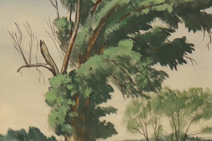 Watercolor focused on single windswept tree by Dickerson. Frame shows similarities to Dickerson’s style of workmanship. Framed with conservation quality materials.